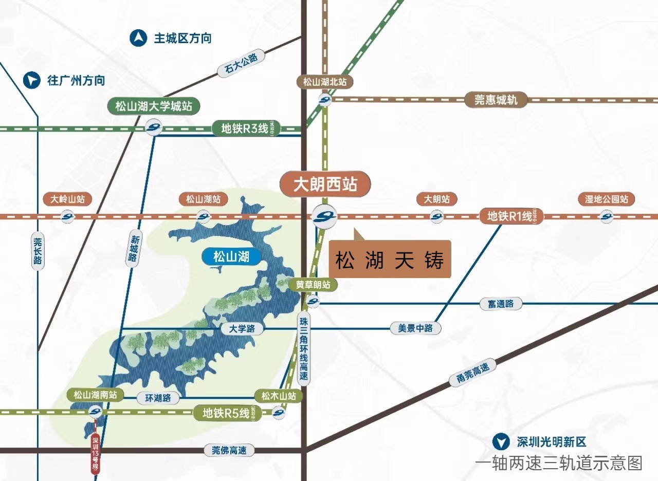 ·圈一軸:緊鄰大朗主軸松佛路,串聯松山湖與主城的必經主干道;